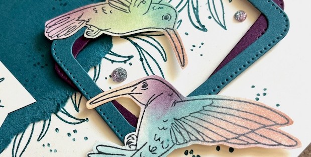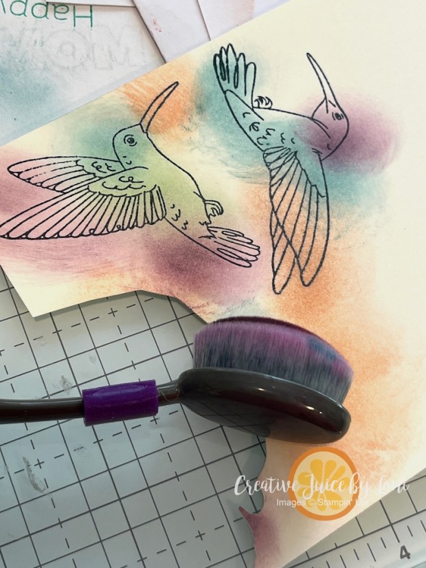 I discovered that my favorite way to color the hummingbirds is with blending brushes and ink pads. No need to be particular… JUST START BLENDING! The soft gradients give them a delicate, natural look and once you fussy cut them out, they look lovely.
