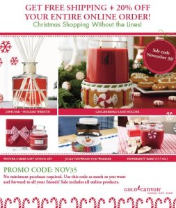 My friend Sue sells Gold Canyon Candles…and this is a great offer: 20% off and free shipping! ‘Tis the season for great sales! Who needs to go to the store this weekend with all the cool stuff online?? Go to her website to order and enjoy some extra “scents” for the holidays 🙂