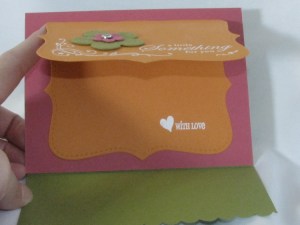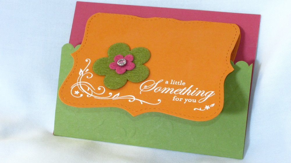 This stamp set is YUMMY…really…it is called “Yummy” and it’s one of the Sale-a-Bration sets you can get FREE during February and March with a $50 purchase. I made this Tri-fold card using the Top Note die, SU! texturz plates and the Big Shot! It is embellished with a few of the Flower Fusion blooms and a rhinestone brad. The Yummy Set is designed to co-ordinate with the Top Note, but is perfect for many occasions. You can’t see the texture on the Green, but these new Texturz plates are so much fun to play with! You could slip a gift card inside this cutie…and here is the inside of