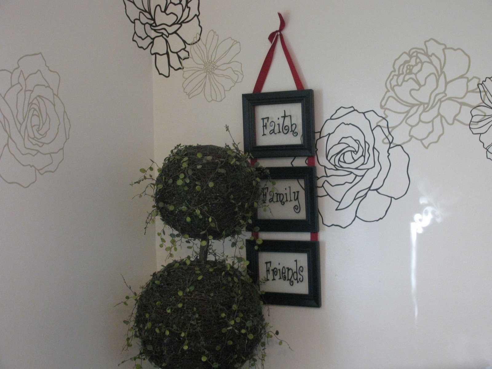 For the two or three of you who *haven’t* been in my home or seen any Decor Elements from Stampin’ Up!, here is a little corner of my rumpus room with the Manhattan Flowers on the wall (The white blob on the right is the sun shining through the window, not a painting mistake). My friend Kelli made the “Faith, Family, Friends” hanging with similar vinyl, but not from SU!