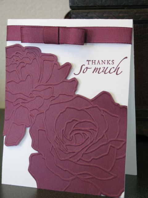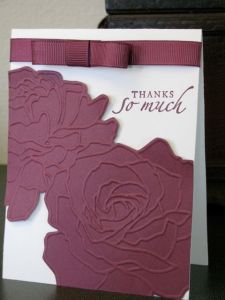 I pulled out the Big Shot to make this card to showcase the Rich Razzleberry In-Color: the flowers are created using the Manhattan Impressions Folder. These flowers definitely make a great “impression”! The grosgrain ribbon is actually polka-dotted on one side this year, but I felt like the elegance of the flowers needed just the plain side of the ribbon. Add a saying from the Sincere Salutations set and it is simply beautiful.