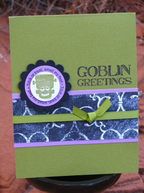 Card Recipe (all supplies from Stampin’ Up!, naturally!): Stamp Sets: Batty for You and Grateful Greetings, Old Olive, Orchid Opulence, Whisper White and Basic Black card stock/ink, Night & Day Designer Series Paper, Old Olive grosgrain ribbon, 1″ and 1 3/8″ circle and scallop circle punch, Stampin’ Dimensionals. Want to order the supplies used for this project? Visit my Stampin’ Up! Website and click on “Order Now”!