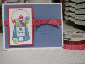 This is the card I am swapping at Stampin’ Up! Leadership in Phoenix this week! It uses the Something Sweet set from the Occasions Mini catalog and I added Crystal Effects to make the gumballs shiny. I’ll post more next week when I return from the warm weather:)
