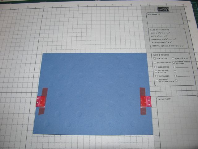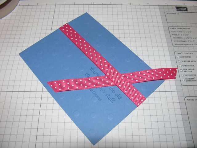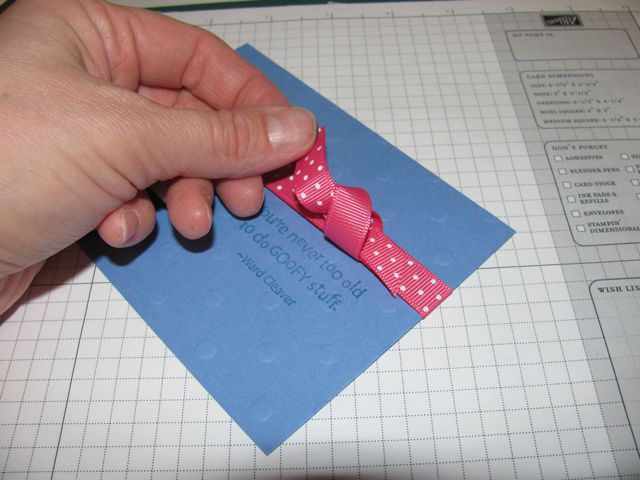 Here is a pictorial for a perfect knot everytime! It works best on a card with layers. Begin by taping a piece of ribbon to the back of the top layer of your card: