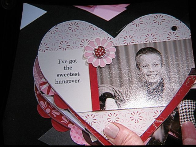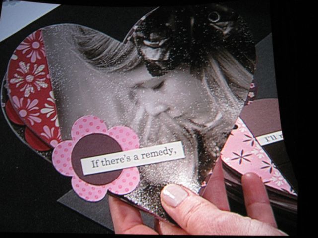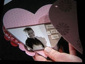 While I was at Stampin’ Up! Leadership, I learned a fun idea from presenter Shannon West and it seems to fit my theme this week of Music and Lyrics. Her suggestion was substitute lyrics from your favorite song as journaling for your scrapbook! You saw a peek at our On Board Heart Book available in the Occasions Mini Catalog (also in Scallop Circle and Bird shapes) in this post, but check out the inside of her Valentine Album…she used lyrics from Diana Ross’ song “Love Hangover”: