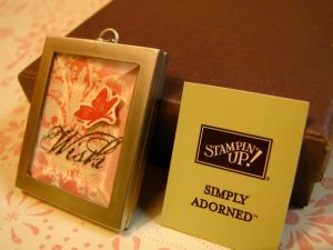 My sister Mindi hit the big 4-0 last week and I wanted to make her a gift with some bling for her Shiny Surprise party (that I was sad to miss), so what better than one of Stampin’ Up!’s new Simply Adorned charms with a personalized insert? I think it will be right up her alley, even if it is late. But she expects no more from me than to be fashionable late 🙂 If you know her, she is all about *sparkly* stuff…and even goes so far as to embellish her feline house-mates with be-dazzled beauty. Since the inserts can be changed according to mood/outfit, I am going to make her a few other glittery choices, too.