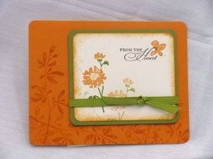 So, needless to say…I am READY TO WELCOME SPRING!!! So to entice Mother Nature to send a little more sunshine, here are a few lovely spring card samples using the Watercolor Trio stamp set from the Summer Mini Catalog and created by some talented demonstrators for the Summer Mini Swap I recently hosted. First, from Kim Innis, a rejuvenating orange beauty: