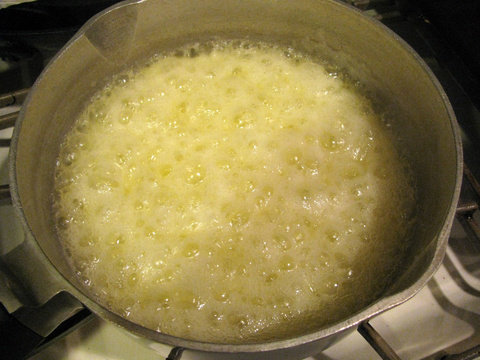 Remove from heat and add 1/2 teaspoon baking soda and 1/2 teaspoon vanilla.