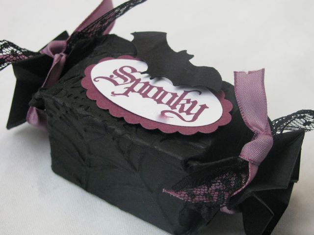 Have I told you how much I love the new Spider Web embossing folder for the Big Shot? Besides using it on my card, I combined it with the Candy Wrapper Die to make the adorable gift below (can you see the little bat on the tag made with the bat punch? Too adorable!)