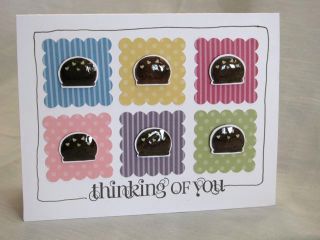 This “box” of chocolate is fat and calorie free 🙂 Playing along with Clean & Simple Sketch 134 today…and I used the Eat Chocolate Stamp set (in Occasions Mini Catalog), Curly Cute stamp set (for greeting), an Early Espresso Ink Pad & Stampin’ Write Marker and the Subtles Patterns Designer Series Paper pack punched with the Scallop Square punch. To make it look good enough to eat, I added Crystal Effects to each piece of chocolate…yummy!