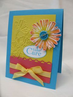 So I took the sketch and ran with it! I immediately thought of a new Hostess Set in the Summer Mini catalog (Love & Care) and combined it with the fabulous new Flower Garden Textured Impressions Embossing Folder (also from the Summer Mini). In an effort to bring a little spring color to our VERY WET and overcast spring here in Utah, I used the brightest colors I could think of: Daffodil Delight, Melon Mambo and Tempting Turquoise.
