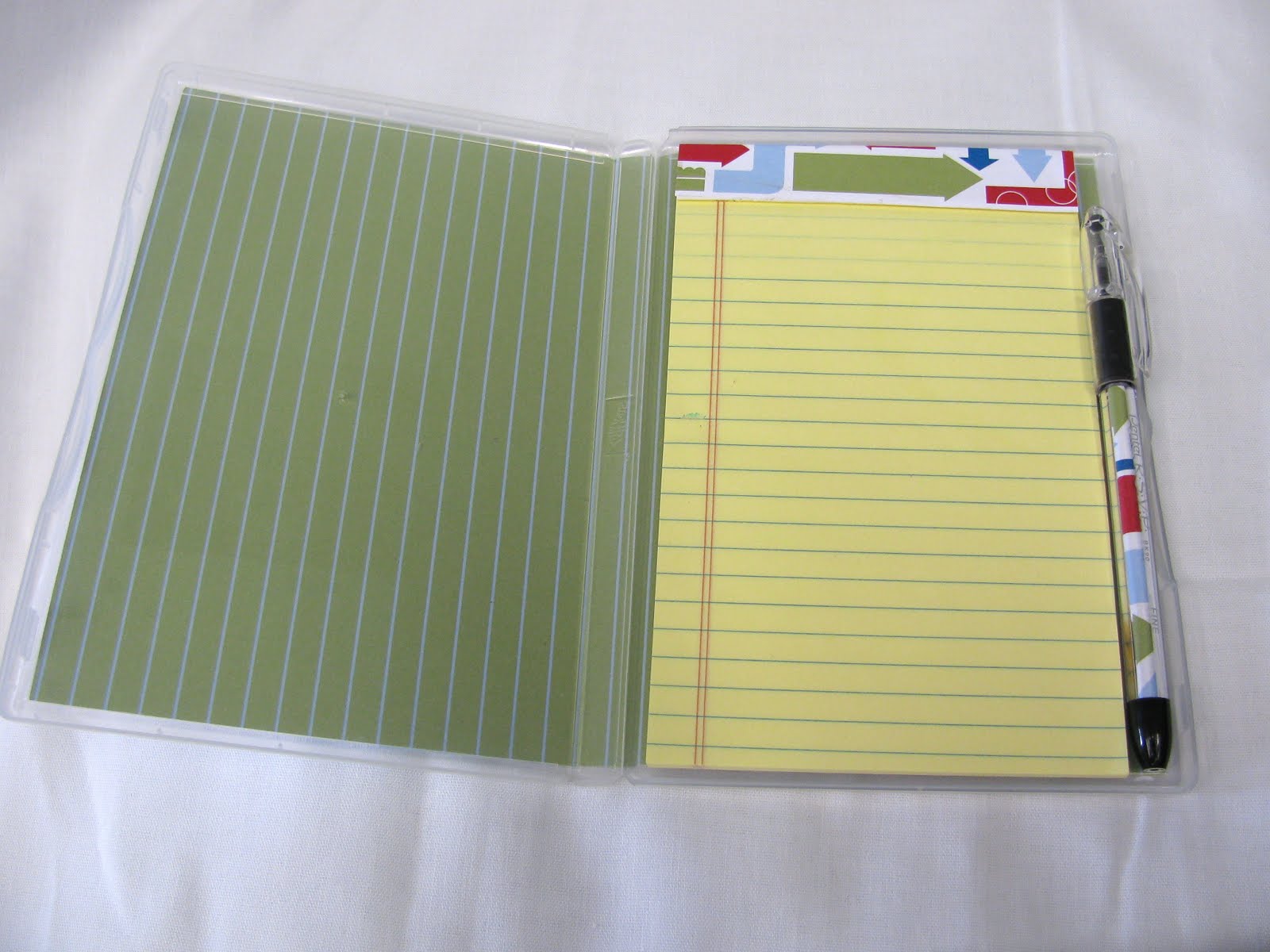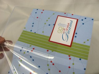 This notebook cover is created with an empty Clear Mount Stamp Case from Stampin’ Up! (Item 119105, $4.95 for 4 of them!!) The cool thing is that they are CLEAR so you can use double sided paper and it slides in the cover like this: