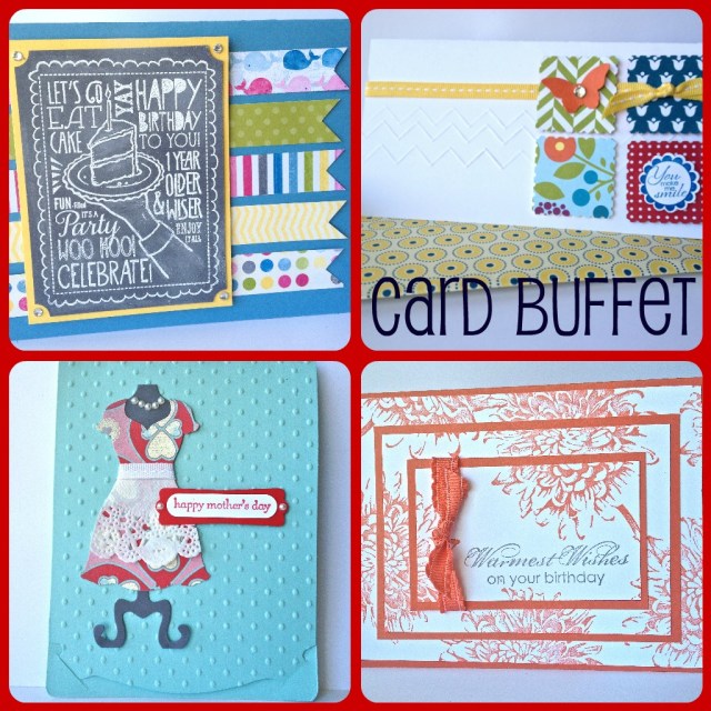 You will make 2 each of the cards shown (you can change the greetings to match almost any occasion) and each card comes with an envelope. Cost: $15.00 Bring your own scissors and adhesive (Snail or Multipurpose Adhesive from Stampin’ Up! is recommended and you can pick up a refill at the buffet, if needed)