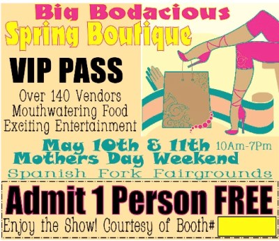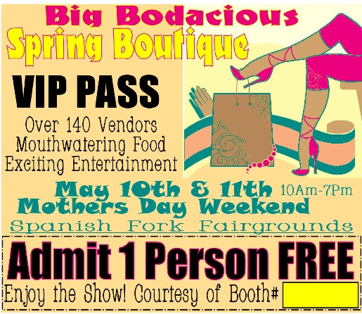 I’ve been working hard to prepare for the Big Bodacious Boutique this weekend in Spanish Fork! I hope you’ll drop by to visit and shop…to make it easier for you to attend, go ahead and print off this VIP ticket and write 128 in the booth box. You can print in color or b&w and share it with your friends!