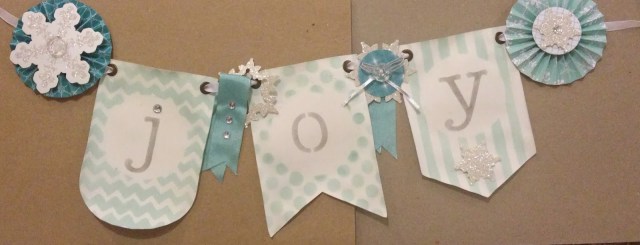 If you can’t come to the class, you can order the Banner Simply Created Kit (#132699) and the Christmas Banner Accessory Kit (#132697) or Halloween Banner Accessory Kit (#132698) and there is enough of the canvas paper pennants to create a few of these at home. You may need ink pads and sponge daubers or Stampin’ Spritzers to create the backgrounds, but the Banner kit has the stencils for the chevron, stripes and polka dots as well as the WHOLE ALPHABET! It’s a great Girl’s Night Project, too, so gather your friends.