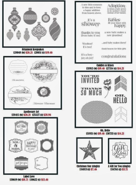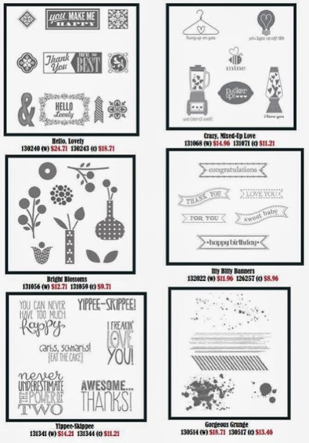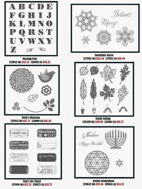 Here are the 25 stamp sets and the 25% off prices (in red)! W=Wood mounted and C=Clear Mount