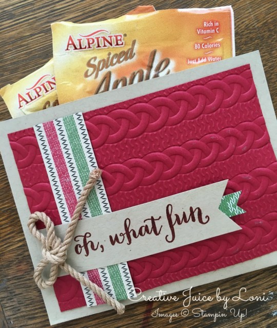 An excuse to wear a warm sweater and drink hot cider is always welcome, so as I was demonstrating this cute card on Facebook Live today (despite having no sound for the first minute), my friend suggested that it would be a perfect pouch for a hot drink, and I concur…so here it is as a pouch: