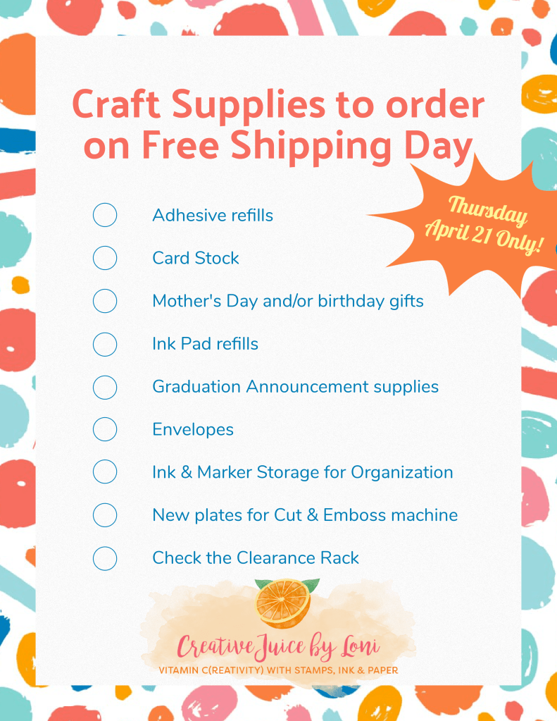 If your stamping studio is your happy place, I have good news for you: Stampin’ Up! is offering FREE SHIPPING today only on orders over $75! Here’s a handy list to take inventory of your supplies: