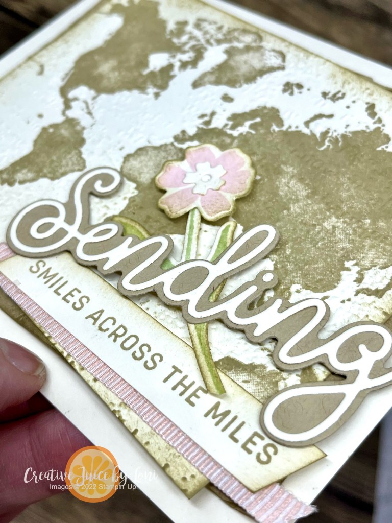 My “Sending Smiles Across the Miles” card begins with the Watercolor World background stamped with Crumb Cake on a 3-1/2″ x 4-3/4″ Very Vanilla card stock, then I embossed it with the Timeworn Type embossing folder. Add a bit of Crumb Cake ink with a blending brush lightly around the edges and layer it over a crumpled/distressed 3-3/4″ x 5″ crumb cake card stock.