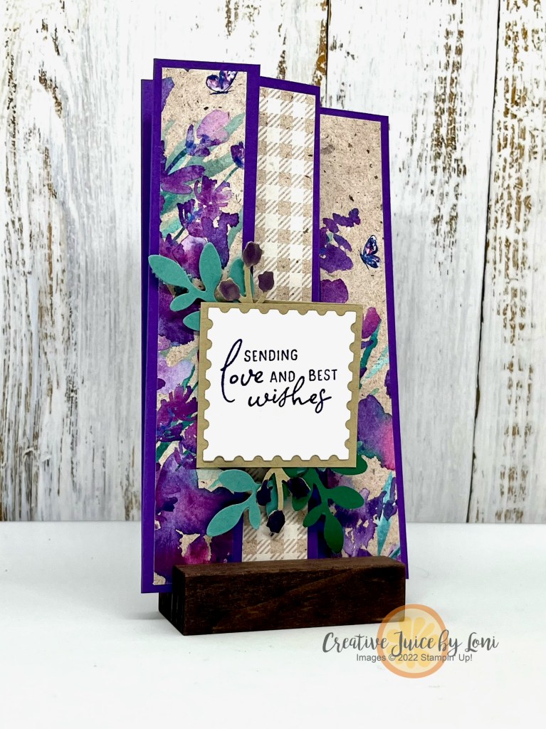 Some patterned paper comes as 12″ x 12″ and a few of our fancy designs are 6″ x 6″, so today (and to help you use up your Paper Share!), I’ve got a fun fold slimline card which uses a 6″ x 6″ piece of Perennial Lavender Designer Series Paper: