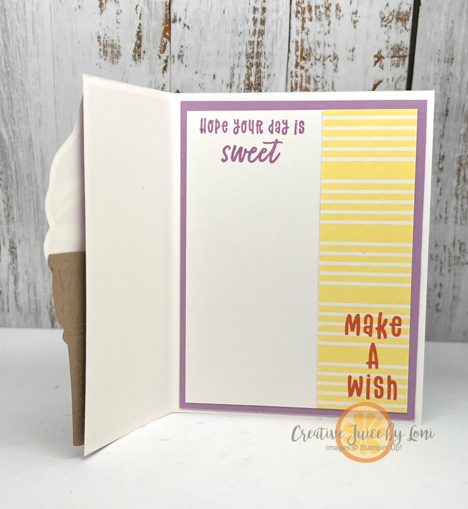 Start with a 5.5″ x 6.75″ card base (scored at 4.25″) and “build” layers with Designer Series Paper. The Lighter Than Air designs have creamy colors that I used to cut 3 swirls from, then built up my lemon-raspberry ice cream swirl. This is a card you’ll want to make triplets of at one time, just to use up all the pieces: