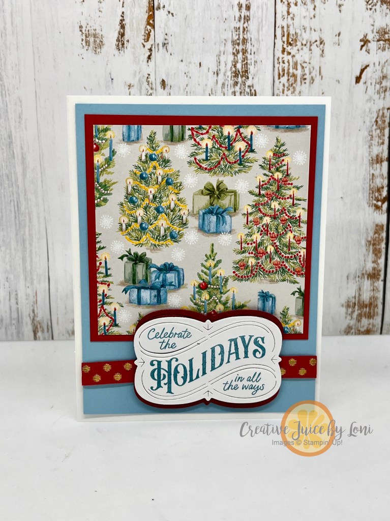 Next is another simple card layout spotlighting a piece of the Sentimental Christmas Designer Series Paper, and showed how to create a contrasting matte behind the label by cutting a second label in half: