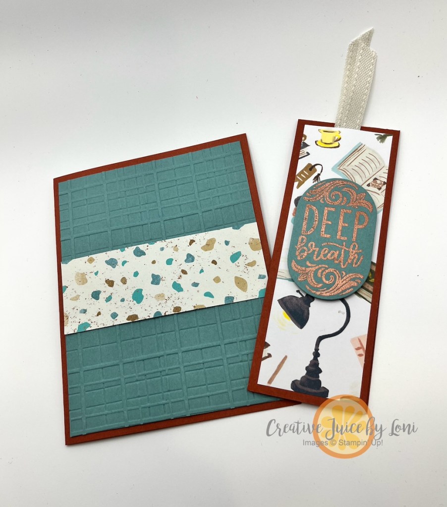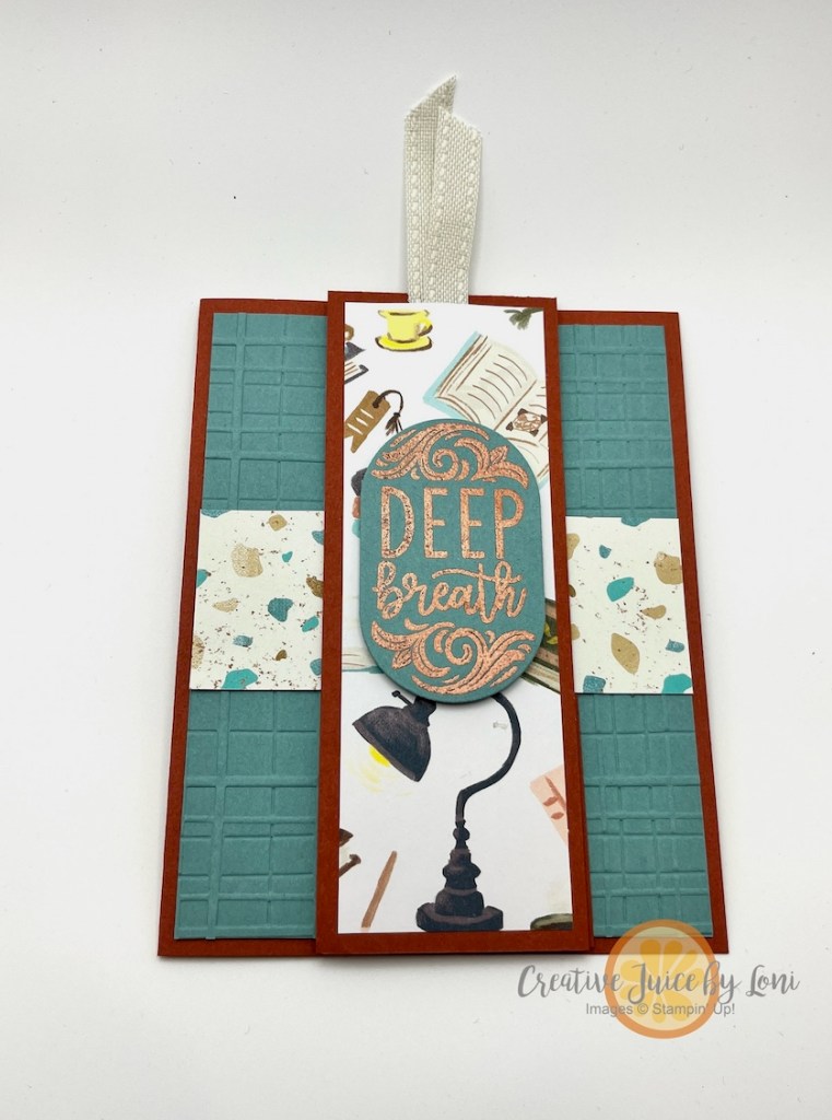 The Stampin’ Up!®️ Hobby Haven suite had the patterned paper appropriate for book lovers, and the bookmark cleverly clasps onto the page you are reading (and the front of the card) with strips of self-adhesive magnet sheets: