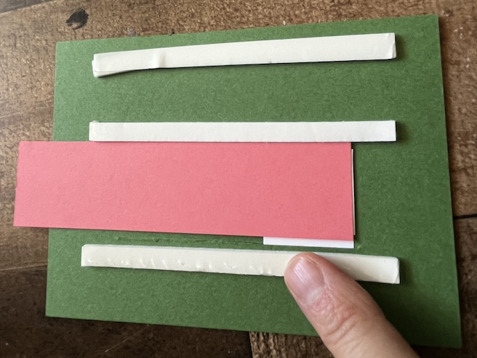 The mechanism is very simple: Just a strip of card stock with a 2″ x 1″ piece of card stock attached at the end. This slides through the slit on the front, then create a “channel” for the tab to slide through on the back using Adhesive Foam Strips: