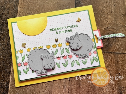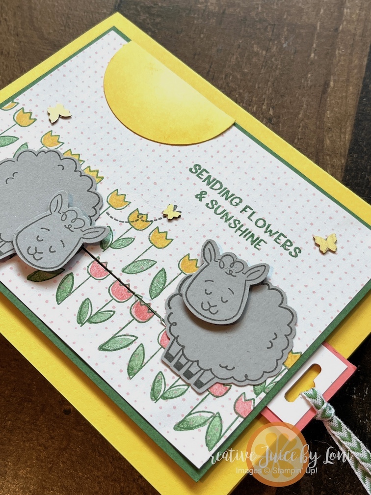 I’m pointing to where the card stock sticks through from back to front. You’ll attach your sheep to that tab on the front with dimensionals.