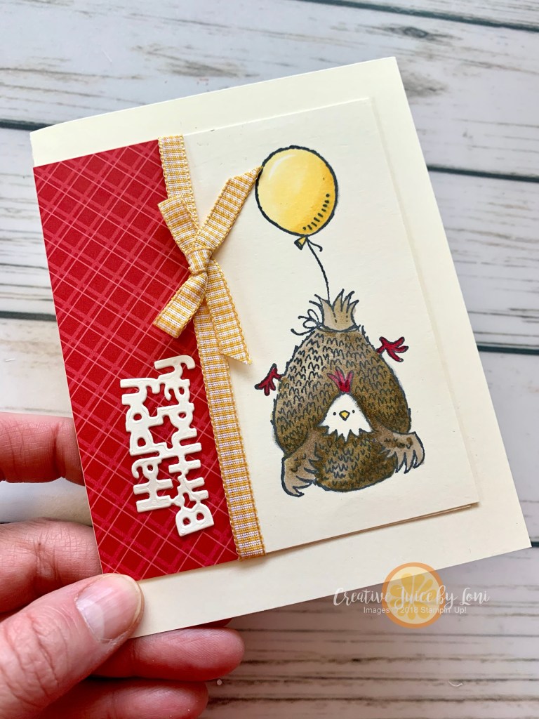 I “sprinkled” the images from the Taco Fiesta stamp set (item #167032, available 1/5/2023) across the glimmer paper 2-3/4″ square to capture the feeling of a party (with chips & guac). You can watch the creation of the card in my video replay: