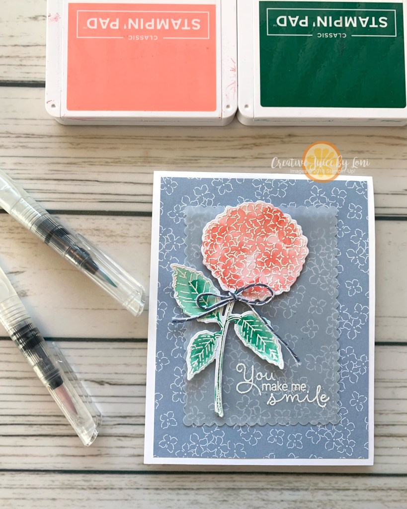 Sharing a few “bonus” project photos with you as well; The first shows how lovely the hydrangea blossom is when embossed in white and watercolored.