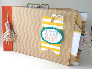 7. If you are using gift wrap, just SCRUNCH it together up the middle fold to gather it. Using DSP (which is a little heavier) you may find it easier to fan fold it as you go along. The cuts you made make it pretty simple to do quickly. Again, this isn’t rocket science, so you don’t have to be exact, just fold it and go! Then grab an old bread twist tie (doesn’t matter what color…mine is BLUE!) and wrap it around the gathers/folds and twist to secure.