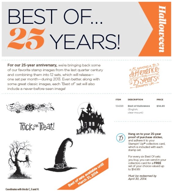 Remember that for every 6 “Best Of” sets you purchase through March 2014, you can choose a FREE stamp set of your choice (up to $14.95 value). Save those 25-year proof of purchase stickers!