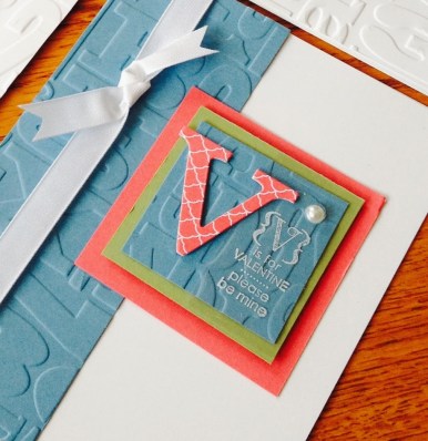 Accessories: Window Sheets (114323), Big Shot, Typset Alphabet Bigz die (127553), Alphabet Press embossing folder (130916), Pearls Basics Jewels (119247), White Taffeta Ribbon (109070),  Scallop Edge Border Punch (119882) and Glue Dots.