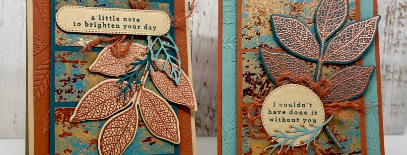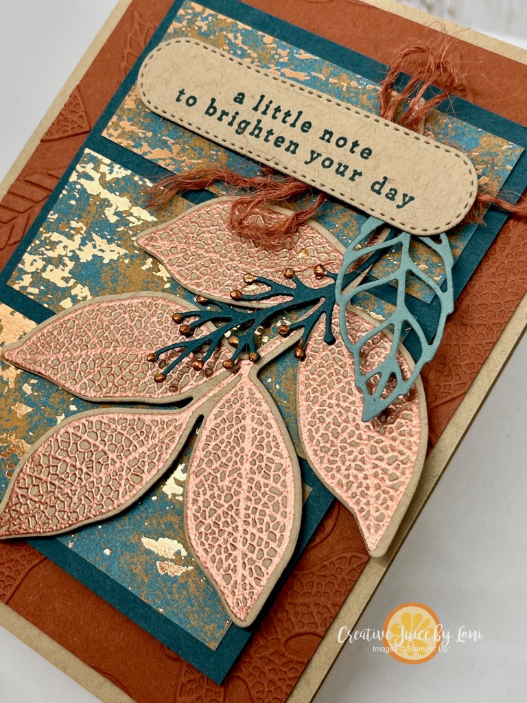Though the extreme summer weather just ended (we are happy to be down to 102º Farenheit), and as much as I enjoy this season, I’m looking forward to the crisp feel of Autumn, so I created my cards using the Changing Leaves bundle (NEW to the Stampin’ Up! Online Exclusives) and the Dry Brushed Metallic Specialty Paper
