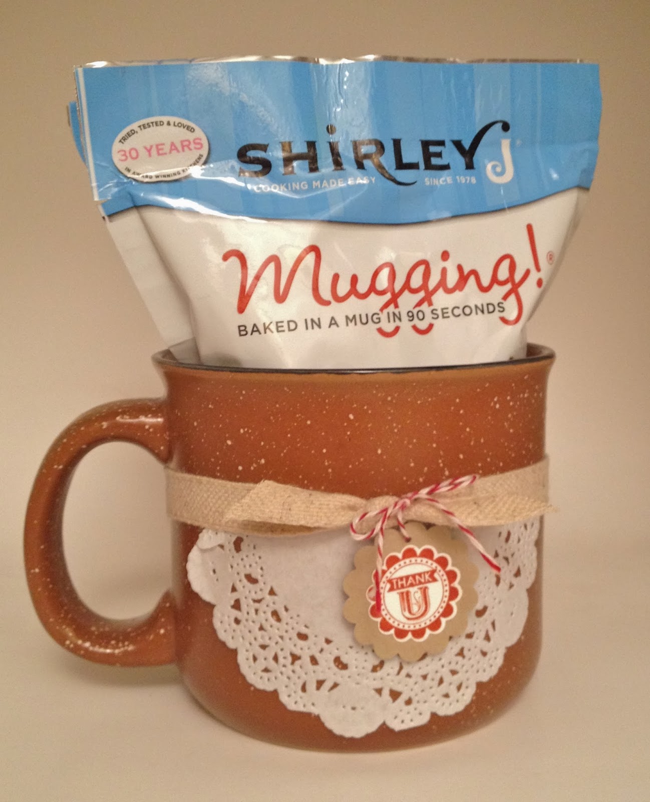 I’ve been looking forward to trying these new “Mugging” mixes from Shirley J and when I saw them at Macey’s today, I had to grab a few, along with this speckled Baked Brown Sugar mug. Add a few Stampin’ Up! supplies to decorate with~Tea Lace Paper Doilies (item 129399), A Round Array stamp set, 7/8″ and 1-1/4″ scallop circle punches (129404 and 127811), 7/16″ Natural Trim (129287), Baker’s Twine and some ink~ and you’ve got a quick gift!