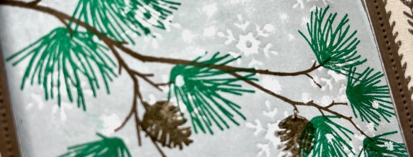 Once the branches were stamped over the snowflakes, that layer was adhered to a 4″ x 5.25″ Cloud Cover card inside (8″ x 10.5″ when open), with the fold on the right: