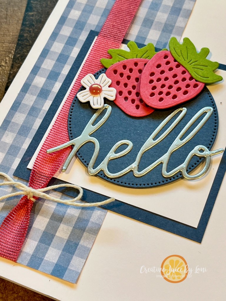 From a silver foil “Hello” to the mouth-watering fruits, this card is quintessential summer! But that’s not all…the dies ALSO cut an ACORN (which will match the September kit!)