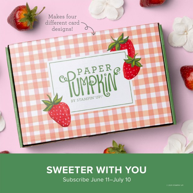 The Sweeter With You July Paper Pumpkin Kit will be a card kit that makes 8 cards: 4 each of 2 different designs featuring sun-kissed strawberries and gingham!