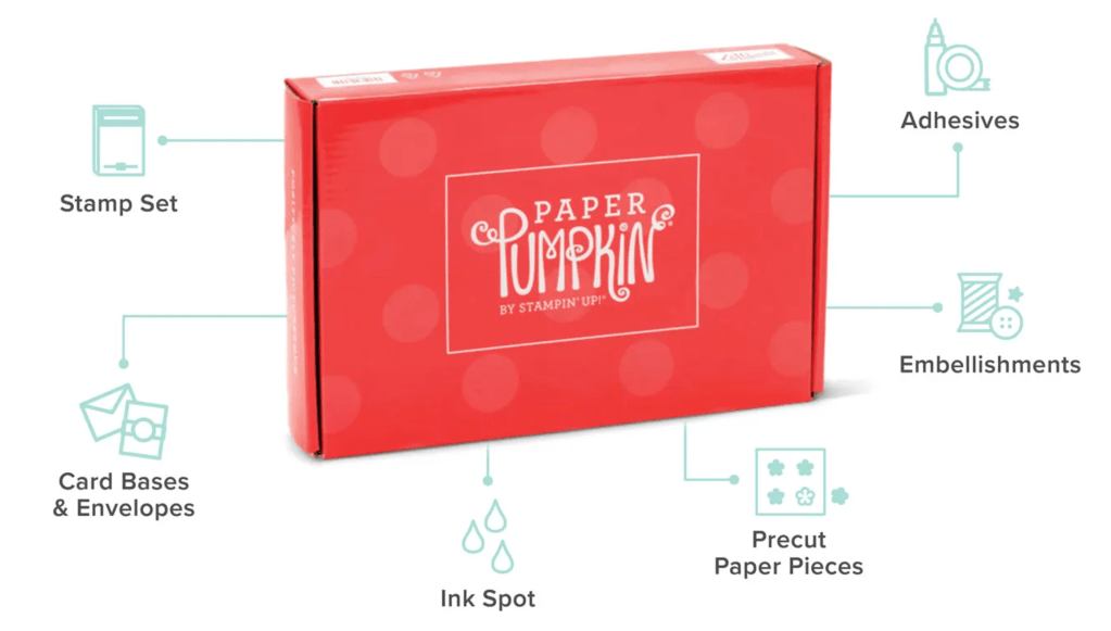 A Paper Pumpkin craft box arrives in your mail on or before the 20th of each month filled with everything you need to make a paper-crafting project: Pre-cut paper, an ink spot in a Stampin’ Up!®️ color, adhesive and an exclusive stamp set. There are also step-by-step instructions in the box AND a how-to video on YouTube each month. Your FIRST kit includes a clear block – keep it handy for future kits!