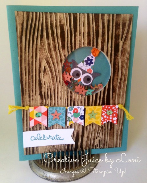 I did my paper piecing a little different as I didn’t have the 3-d glue suggested in the tutorial video, so I cut out the largest whole elephant image (including hat), then layered it on my base with the Multipurpose Liquid Glue, next cut out the elephant head/trunk/hat and adhered that, and finally, the party hat! Other than that, I followed the tutorial substituting the tools I had from Stampin’ Up!