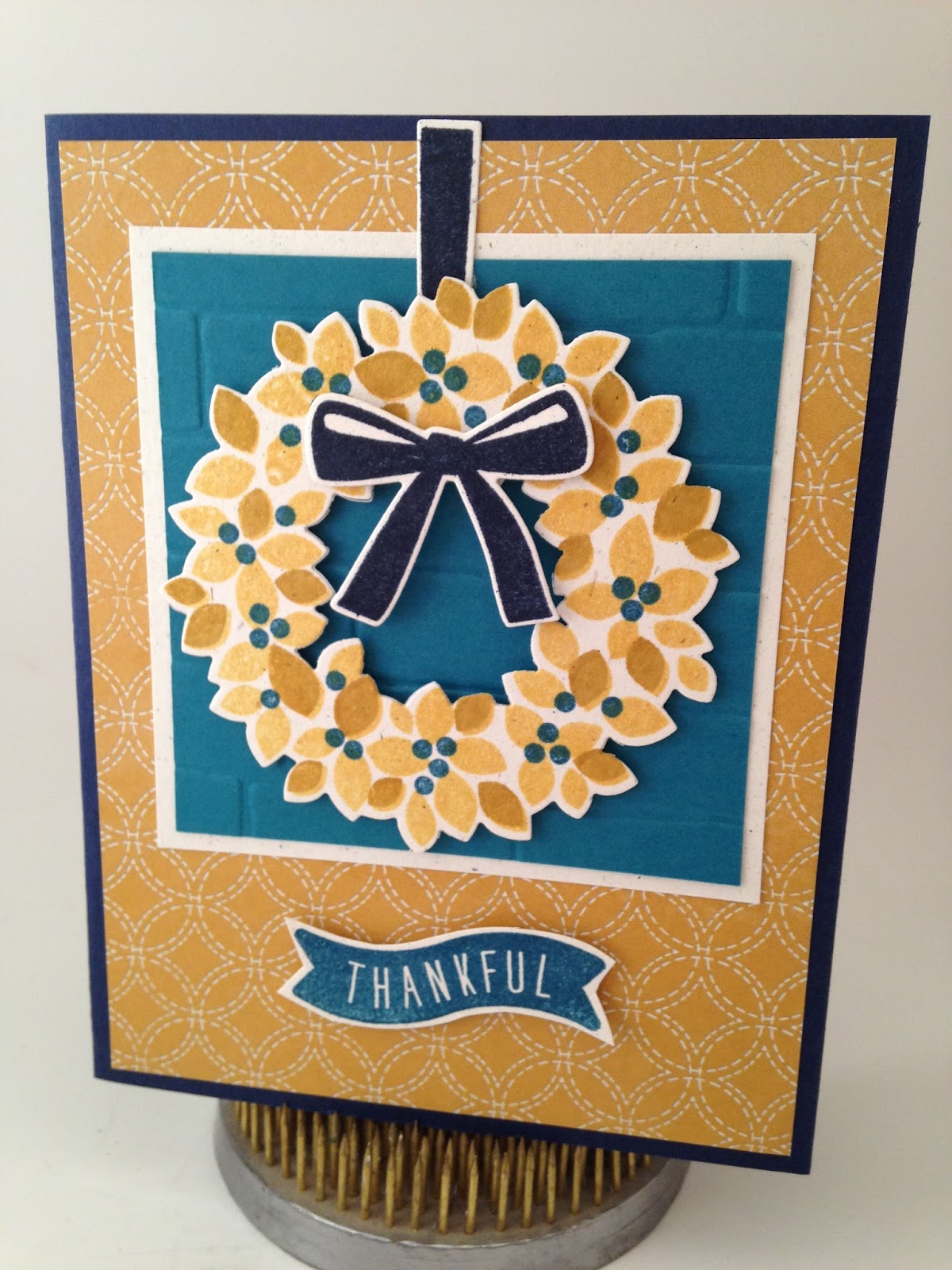 Accessories: Primrose Petals 3/8″ Stitched Satin Ribbon (#126844), Gold Sequin Trim (#132983), Multipurpose Liquid Glue, Circle Collection Framelits, Big Shot, 2-1/2″ Circle Punch (#120906), Essentials Paper Piercing Pack (#126187), Paper Piercing Tool, Stampin’ Pierce Mat, Stylus, Stampin’ Dimensionals