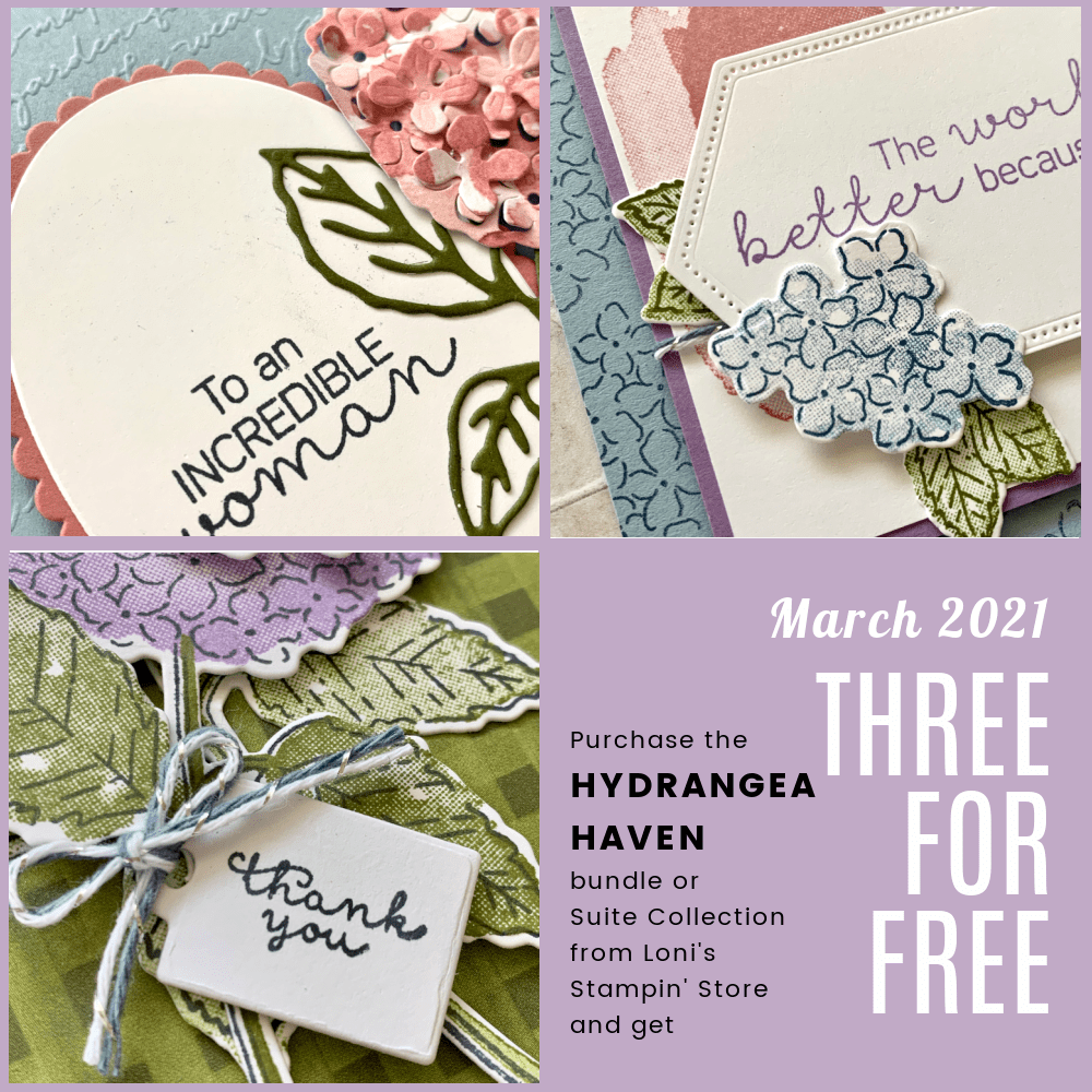 Each month I offer a different “free kit” for a bundle from the newest catalog: During March, when you purchase the Hydrangea Haven bundle (or Hydrangea Hill Suite Collection available again mid-March), I will send you 3 tutorials by email and the consumable supplies via USPS to complete the projects.