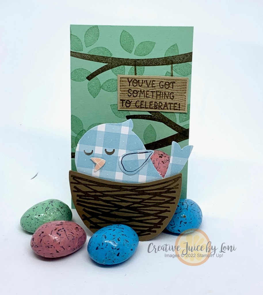 Because Stampin’ Up! added a few catalog products to the choices for Sale-a-Bration, the Songbird Builder Punch is on the list you could choose free with your $50 US order before February 28, 2023, and while you don’t need the stamp set to create cute birds with the Country Gingham Designer Series Paper, the Sweet Songbirds stamp set does give you options for sentiments, nests and branches.