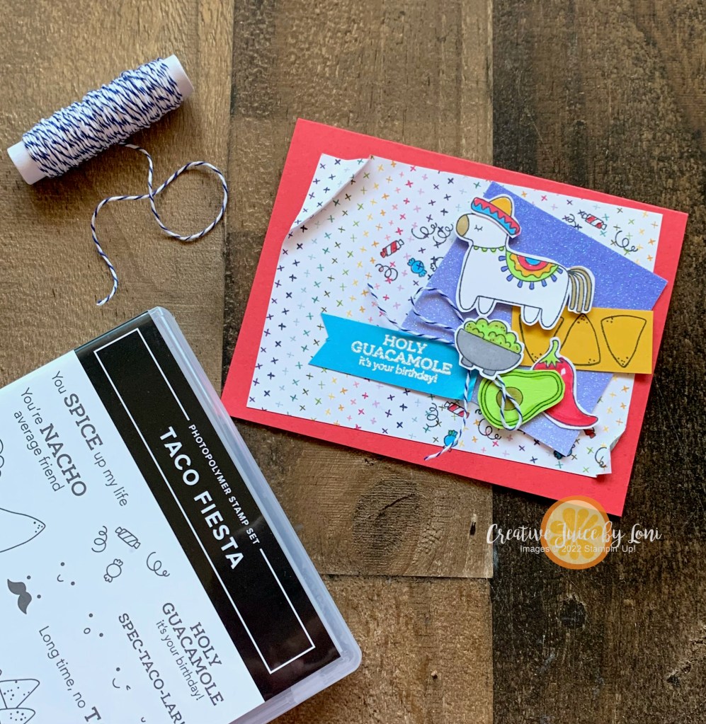 I “sprinkled” the images from the Taco Fiesta stamp set (item #167032, available 1/5/2023) across the glimmer paper 2-3/4″ square to capture the feeling of a party (with chips & guac). You can watch the creation of the card in my video replay: