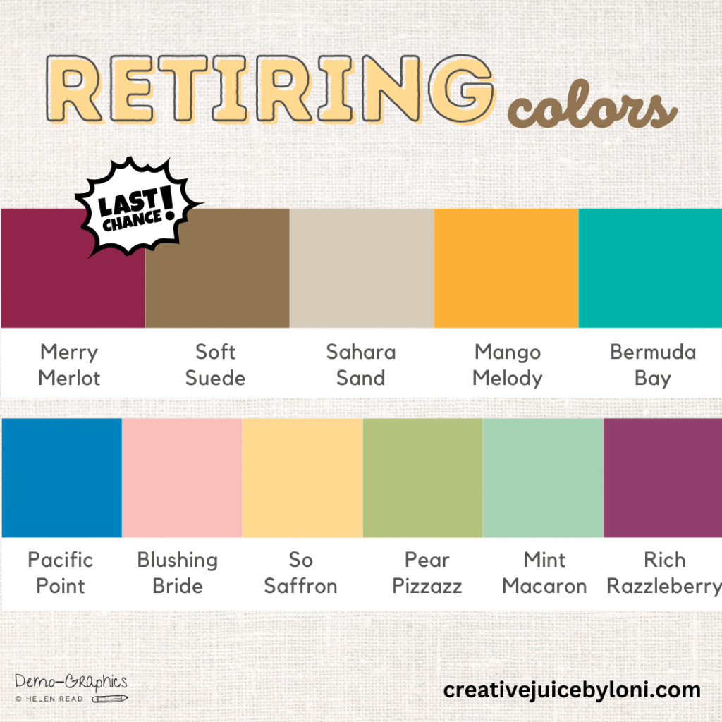A flurry of activity at Stampin’ Up! the past few days: Demonstrators were given a peek into the COLOR REFRESH that is coming with the new Annual Catalog on May 2nd – including the 2023-2024 IN COLORS – as well as a list of all the retiring products (see below).