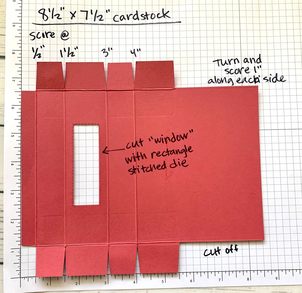 This is my fancy project sketch and dimensions (bold lines are where you will cut). It may help as you follow along with the video tutorial (feel free to pause the video as you learn). You can get both pieces from one sheet of 8.5″ x 11″ card stock.