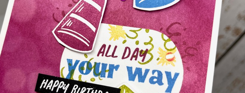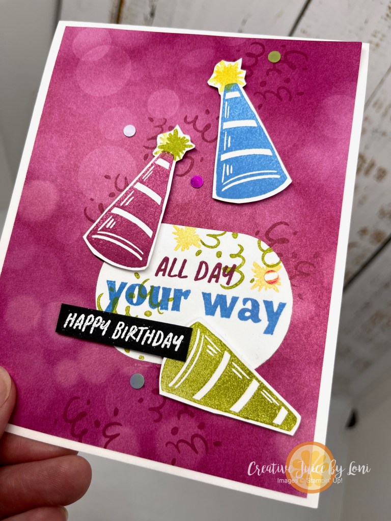 One of the Sale-a-Bration choices is the “Day to Celebrate” photopolymer stamp set, and it is primed to party for anything you want to commemorate! This birthday card shows how one of the stamps could be used as a party hat OR a megaphone, and paired with the Beautiful Bokeh paper just released in the 2025 January-April mini catalog, it feels celebratory, indeed.