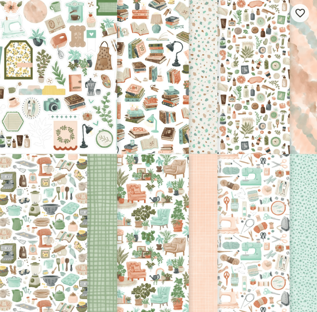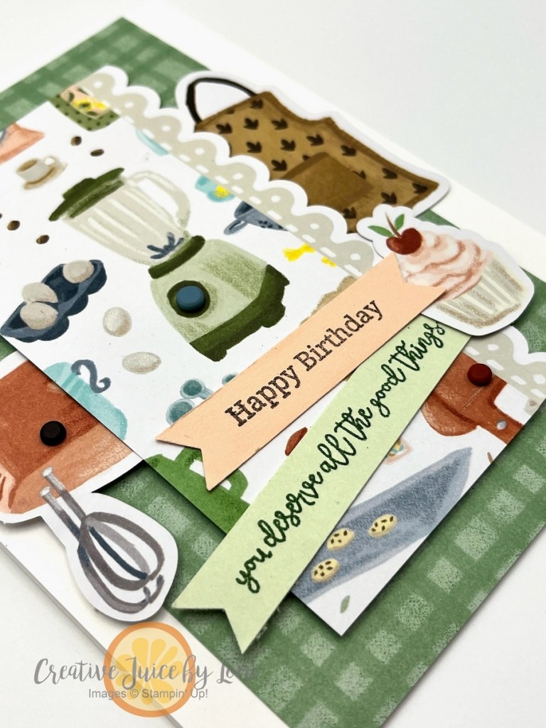 The Hobby Haven pack of Designer Series Paper includes 2 sheets of pre-cut images, so that made it easy to group all these kitchen/baking items together, along with the kitchen-themed patterned paper. In addition to BAKING, there are patterns and die cut images for SEWING, READING, SELF-CARE, GREEN-THUMBS/PLANTS… all the cozy hobbies!
