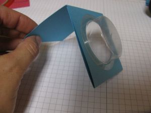 Step 3: Fold the Turquoise card stock and punch a hole with the 1 3/4″ Circle Punch in the center square and one side (HINT: glue a punched circle from a different color in the center to ensure perfect